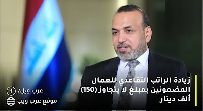 عاجل .. عاجل وزير العمل يزف بشرى زيادة في رواتب متقاعدي العمال. اعلن وزير العمل والشؤون الاجتماعية السيد احمد الاسدي عن اقرار زيادة جديدة في رواتب متقاعدي العمال المضمونين تصل الى 150 ألف دينار خلال جلسة مجلس الوزراء المنعقدة اليوم الاثنين 10 حزيران. واوضح السيد الاسدي ان الزيادة ستكون على الحد الادنى للراتب بمقدار 350 ألف دينار، ليصبح 500 ألفاً، مشيرا الى الزيادة المقررة للرواتب تبدأ من 87 ألفاً لغاية 150 ألف دينار.